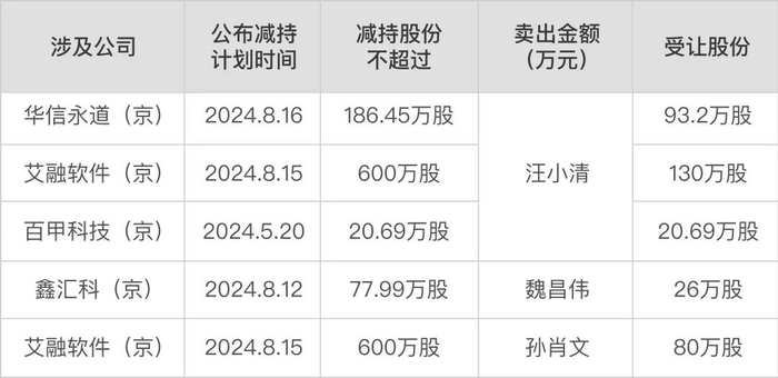 然而,投机获利的前提是必须持有股票,因此那些已公布减持计划的北交所上市公司,成为了投机者的目标。而华信永道、艾融软件、鑫汇科等公司,在今年8月中旬均有大股东发布了减持计划。