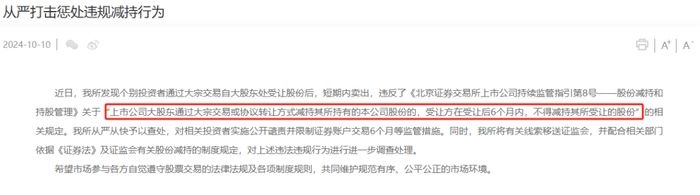 日前,北交所发布公告,强调将从严打击违规减持行为。其中提到,个别投资者通过大宗交易自大股东处受让股份后,短期内卖出,违反了受让方在6个月内不得减持其受让股份这一规定。