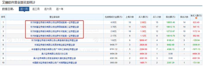 除了返还差价以外,源媒汇还发现,自9月27日以来,艾融软件登上龙虎榜的次数高达17次。而登上艾融软件龙虎榜次数最高的四家营业部,为东方财富旗下的拉萨团结路第一、第二证券营业部和东环路第一、第二证券营业部。