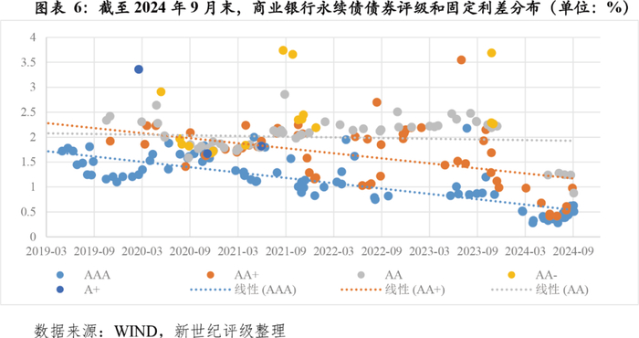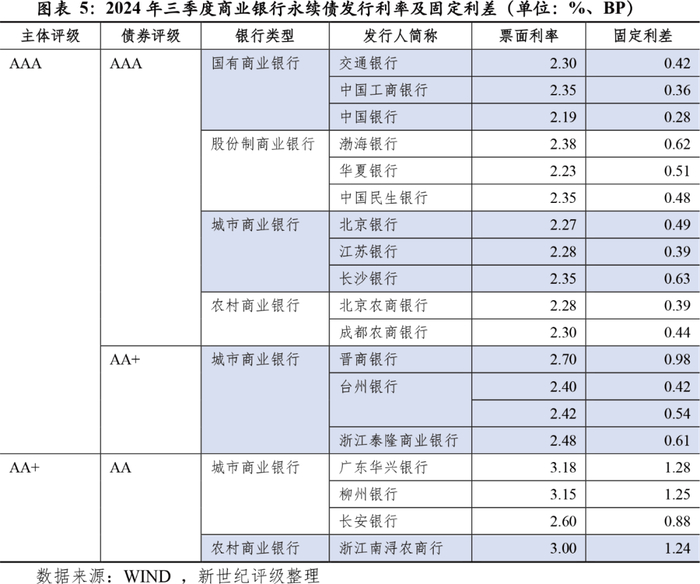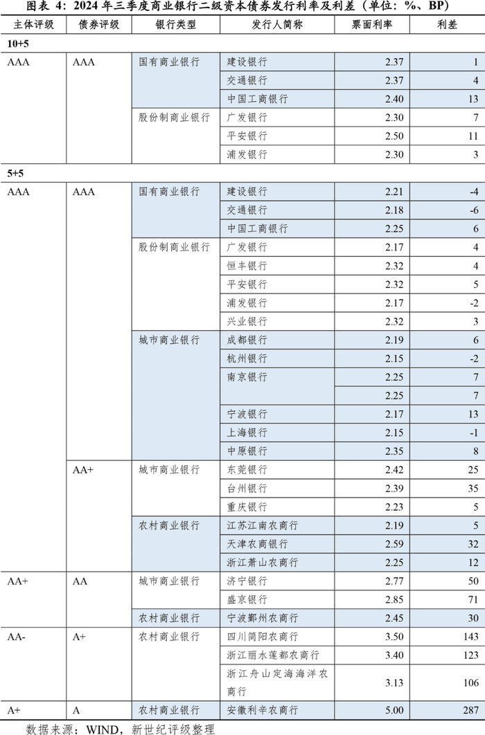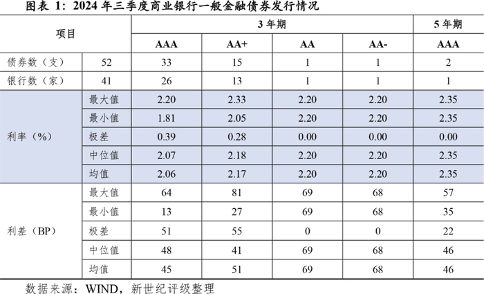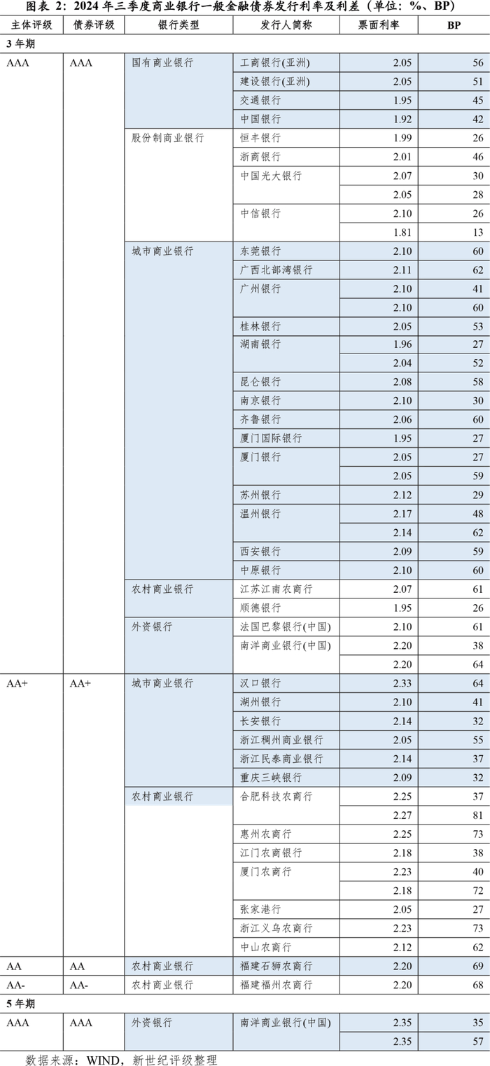 我们对商业银行一般金融债券的利差分析,系使用债券票面利率(平价发行)减去发行起始日相同期限的中国货币网国债到期收益率得出利差并进行比较。2024年三季度,商业银行3年期AAA级金融债券发行利差的均值为45BP,AA+级金融债券利差均值为51BP,5年期AAA级金融债券发行利差的均值为46BP。