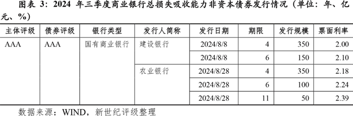总损失吸收能力非资本债券是指全球系统重要性银行为满足总损失吸收能力要求而发行的、具有吸收损失功能、不属于商业银行资本的金融债券。当全球系统重要性银行进入处置阶段,二级资本工具全部减记或者转为普通股后,人民银行、国家金融监督管理总局可以强制要求总损失吸收能力非资本债券以全部或部分方式进行减记或转为普通股。2024年第三季度,商业银行总损失吸收能力非资本债券发行数量为5支,发行规模合计1000亿元,发行主体涉及两家国有大型商业银行,发行情况见下表。截至2024年9月末,商业银行总损失吸收能力非资本债券存量规模合计1800亿元,发行主体包括工商银行、中国银行、建设银行和农业银行。