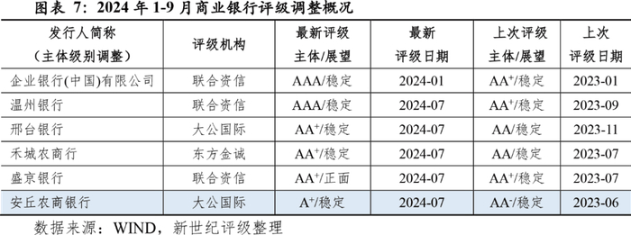 根据WIND统计,2024年1-9月,行业内有6家银行涉及主体评级调整[1],其中4家主体级别调升,1家主体评级展望调为正面,1家主体级别调降。