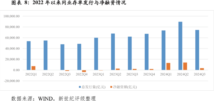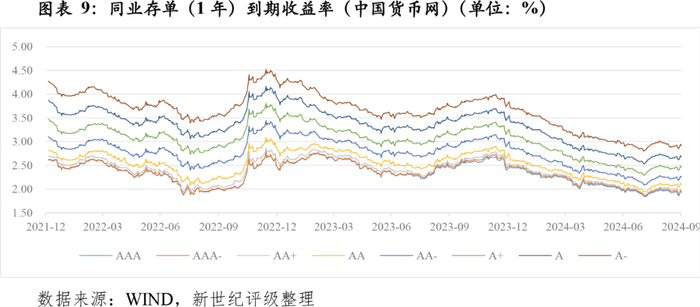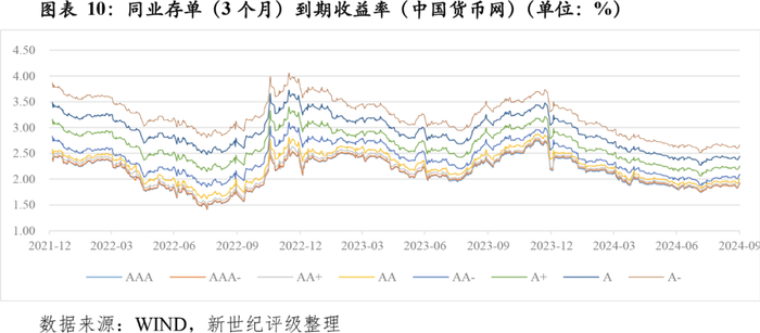 2024年1-9月,有6家商业银行涉及主体评级调整,其中4家主体级别调升,1家主体评级展望调为正面,1家主体级别调降。从三季度债券发行情况来看,41家银行发行一般金融债券2779亿元,2家银行发行总损失吸收能力非资本债券1000亿元,27家银行发行二级资本债3509.50亿元,18家银行发行永续债2312亿元。三季度同业存单净融资额为0.35万亿元,到期收益率维持低位。