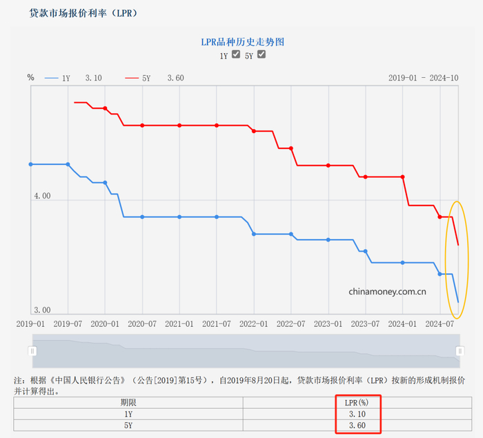 据央行网站消息,中国人民银行授权全国银行间同业拆借中心公布,2024年10月21日贷款市场报价利率(LPR)为:1年期LPR为3.1%,5年期以上LPR为3.6%。这意味着,两档LPR均“降息”0.25个百分点。2024年9月20日贷款市场报价利率(LPR)为:1年期LPR为3.35%,5年期以上LPR为3.85%。