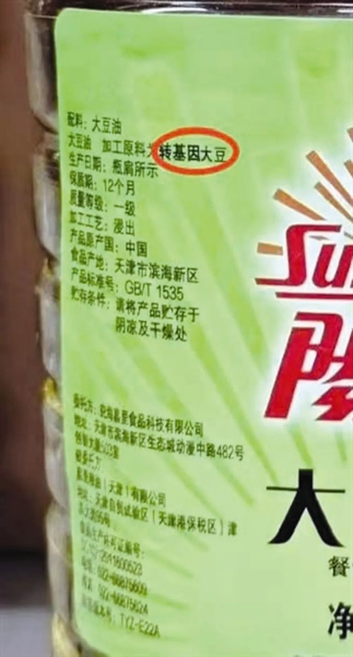 日前,记者跟随天津河西区市场监管执法人员在对一家肯德基进行巡查时发现,该店内有两桶标明为“益海嘉里荣誉出品”的“阳光牌”大豆油。该桶装油的显著位置还标明了“餐饮原料”“非零售”。执法人员仔细查看该产品的配料表发现,该产品标明加工原料为转基因大豆。