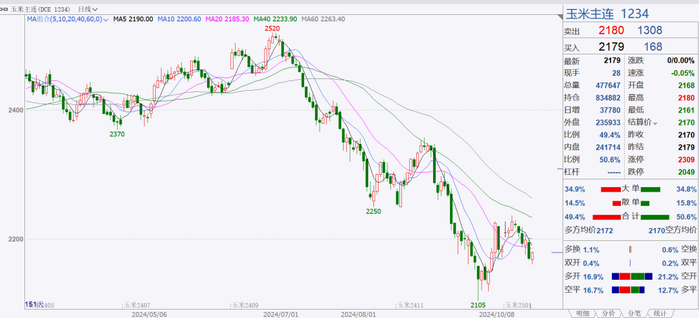 玉米盘面主力合约从15日开始连续多日回落,从上周四(17日)跌破2200关口以后,连续四日震荡下行,今日盘中最低跌至2161元,创近期新低。不过周二下午尾盘有上攻迹象,以接近全天最高价2179收盘,说明下方支撑比较强,有望迎来转机。