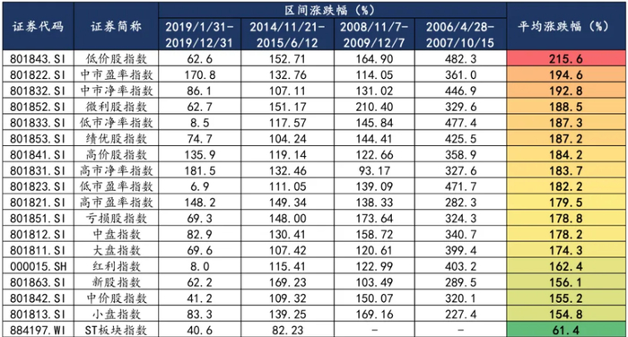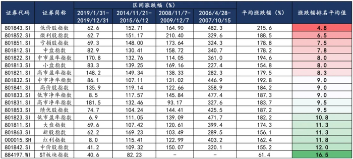 持续上涨期(第二阶段),低价股指数、中市净率指数和中市盈率指数平均涨幅靠前