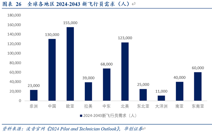 飞行培训是公司目前主力机型最重要的应用场景,以DA40、DA42、DA20为主,客户为全球的专业飞行学院、航空公司培训中心等机构。波音2024年发布的《飞行员和机务展望》,预计未来20年飞行员存较大缺口,美国市场飞行需求稳定增长,我国市场有较大的潜力。