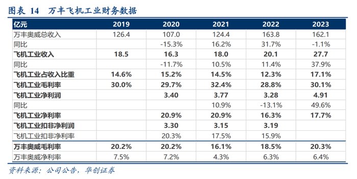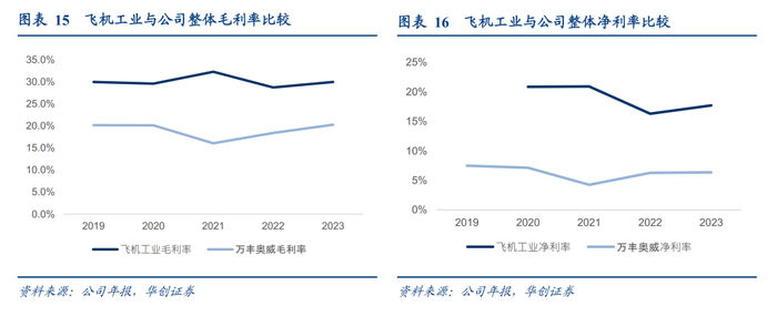 飞机工业毛利率基本维持在30%左右的水平,高于万丰奥威整体20%左右的毛利率,20-23年净利率平均约19%,超出上市公司净利率10个百分点以上。