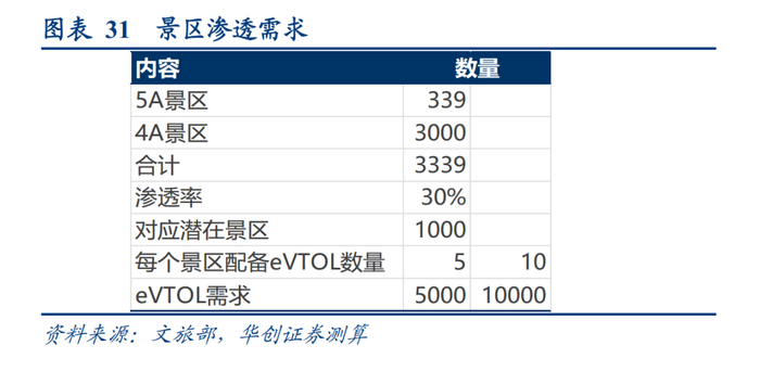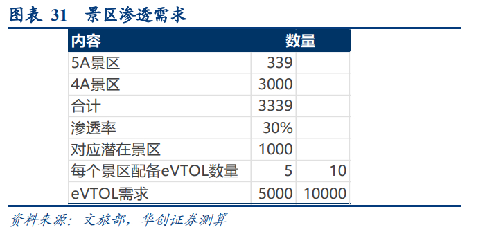 假设在2027年有三分之一的4A级以上景区引入eVTOL低空游览,一个景区5-10架,则至少5000-10000架需求。