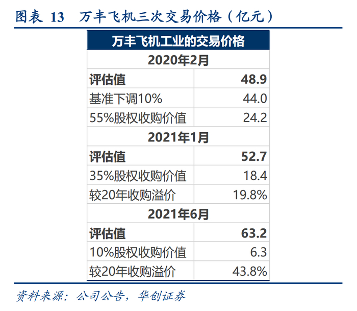3)2021年6月,万丰航空转让10%股权给航发基金,较公司收购基准溢价约44%