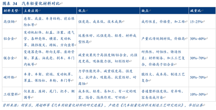 目前广泛应用的汽车轻量化材料主要包括:高强钢、铝合金、镁合金、碳纤维以及工程塑料等,其中碳纤维复合材料减重效果最佳,但是目前车用碳纤维尚处于研发探索阶段,并且材料成本高、制造工艺复杂。
