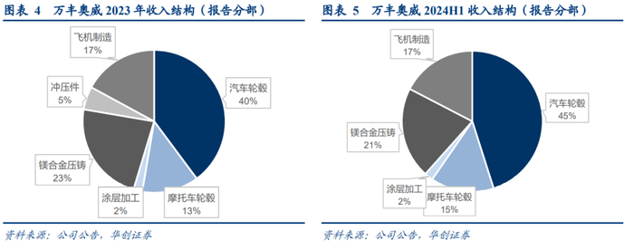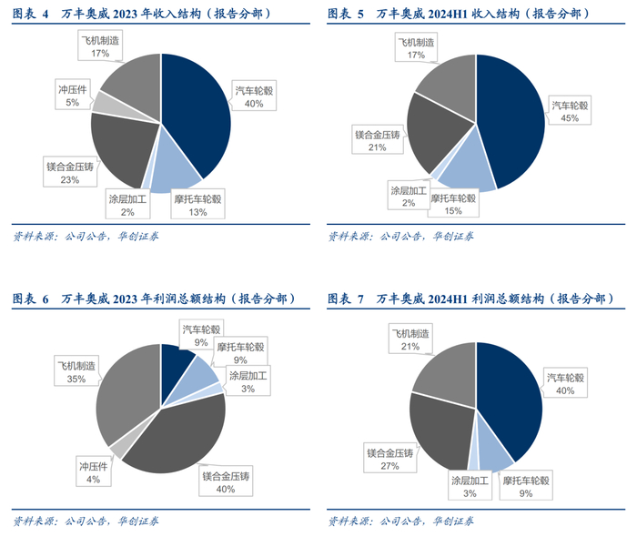 3、从报告分部看,24H1利润总额占比中,飞机制造占21%、汽车轮毂占40%、镁合金压铸占27%、摩托车轮毂占9%、涂层加工业务占3%。