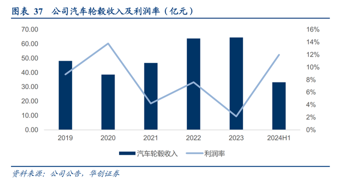 公司汽车铝合金轮毂业务21-23年收入分别为47、63及65亿元,24H1为33亿元,