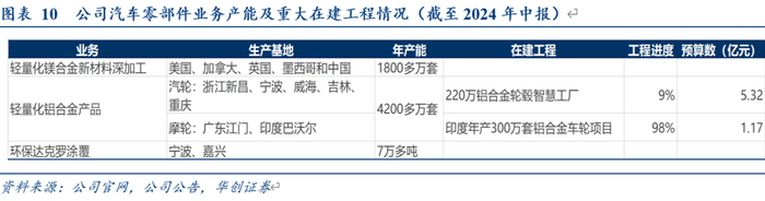 铝合金汽轮:吉林、重庆、威海、宁波、新昌五大生产基地,年产1800万套铝合金轮毂,重大在建工程220万铝合金轮毂智慧工厂在建项目,截至2024年中报,进度9%。