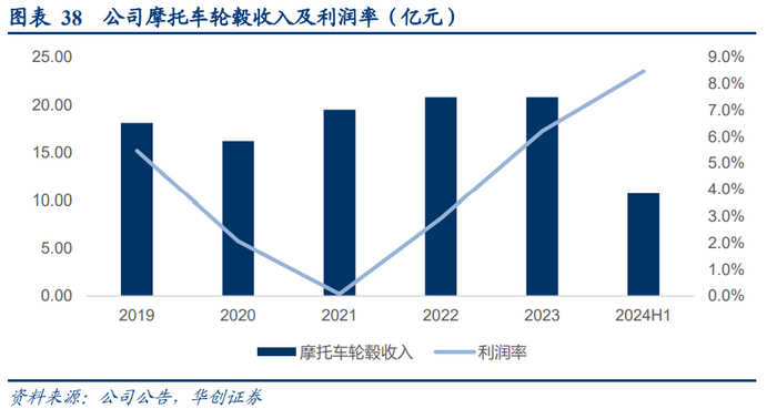 铝合金摩托车轮毂:产品涵盖10至19英寸不同规格、1500多个品种的摩轮。主要客户包括大长江、铃木、HERO等全球顶级摩托车主机厂。2023年合计营收21亿元,占公司总营收13%。