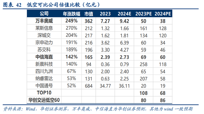 今年以来涨幅前10标的对应23年平均PE108倍,2024万得一致预期利润PE68倍截至10月21日收盘价。公司在低空经济领域属于估值较低水平