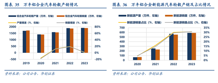 公司铝合金汽车轮毂年拥有1800万套以上年产能,并有浙江新昌、宁波、威海、吉林、重庆五大生产基地。近年来新能源产销占比分别由2020年的4.6%、4.8%增长至2023年的31%、31%。