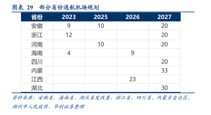 海南省2023年有4座,规划到2026年9座;浙江省2023年有12座,规划到2027年建成20座;四川、湖北、内蒙规划2027年分别达到20座、33座、20座通航机场。