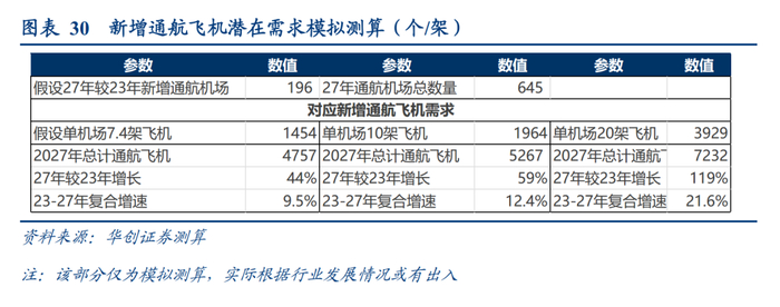 我们预计27年通航飞机数量较23年增长44-119%。我们按照单机场对应飞机数量7.4、10、20架来测算,2027年较23年新增1454、1964、3929架飞机。