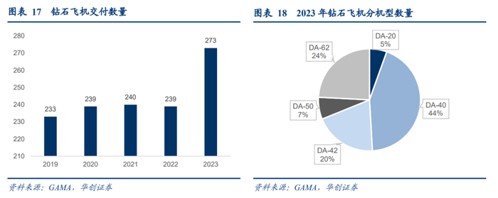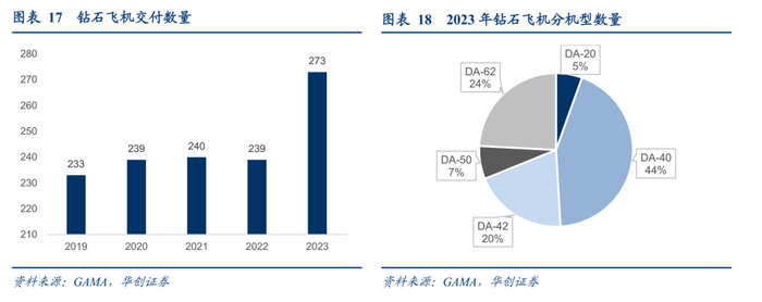 2、DA40是主力机型。2023年DA-40交付119架,占比44%,DA-62交付66架,占比24%,DA42交付54架。DA50是新型号,2021-23年分别交付7、16、19架,体现新动能,23年占比7%。