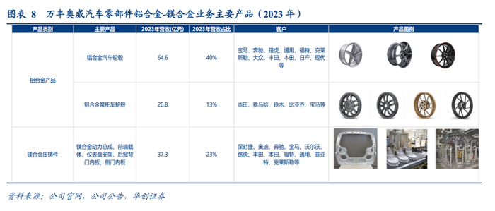 铝合金汽车轮毂:产品包括铸压、锻造、旋压等系列轮毂,主要客户包括宝马、奔驰、路虎、通用、福特、克莱斯勒、大众等体系的优秀配套商。2023年合计营收65亿元,占公司总营收40%。