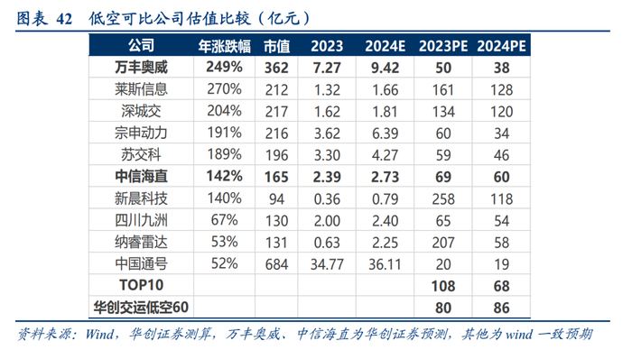 今年以来涨幅前10标的对应23年平均PE108倍,2024万得一致预期利润PE68倍(截至10月21日收盘价)。公司在低空经济领域属于估值较低水平。