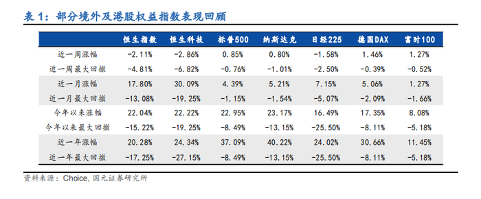 主要权益指数近一周表现:恒生指数(-2.11%)、恒生科技(-2.86%)、标普 500(0.85%)、纳斯达克(0.80%)、日经 225(-1.58%)、德国 DAX(1.46%)、富时100(1.27%)。
