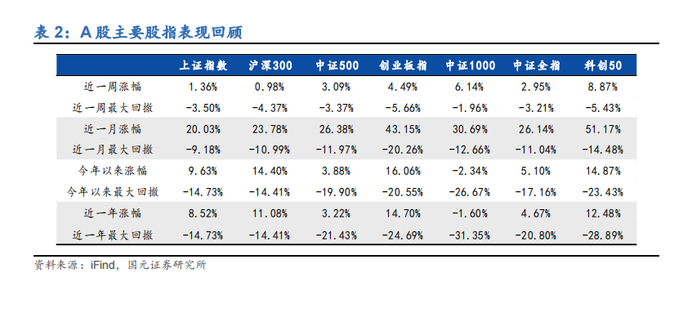 宽基指数表现(近一周/今年以来):上证指数(1.36%、9.63%)、沪深 300(0.98%、14.40%)、中证500(3.09%、3.88%)、创业板指(4.49%、16.06%)、中证 1000(6.14%、-2.34%)、科创 50(8.87%、14.87%)。