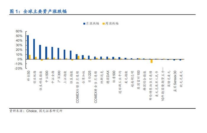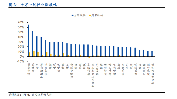上周 30 个申万一级行业中 25 个行业上涨,上周相对表现较好行业及涨跌幅(周、月):计算机(11.15%、52.96%)、国防军工(9.01%、33.80%)、电子(8.86%、41.24%);上周相对表现较差行业及涨跌幅(周、月):食品饮料(-3.21%、24.21%)、石油石化(-1.61%、11.90%)、煤炭(-0.97%、13.76%)。近一个月表现较好行业及涨跌幅(周、月):综合金融(8.63%、65.29%)、计算机(11.15%、52.96%)、电子(8.86%、41.24%)。