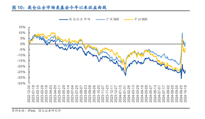 今年以来,高仓位全市场类基金涨跌幅-9.95%,跑输沪深 300 和中证 500,两只指数涨幅分别为 14.40%、3.88%。今年以来,各行业主题基金普遍分化严重,其中港股涨幅最大,周期和医药跌幅最大。