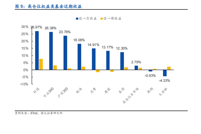 近一月来看,高仓位全市场类基金涨跌幅 2.79%,跑输沪深 300 和中证 500,两只指数涨跌幅分别为 23.78%、26.38%。高仓位行业主题基金中,近一个月涨跌不一,科技和制造表现最佳,大金融跌幅最大。