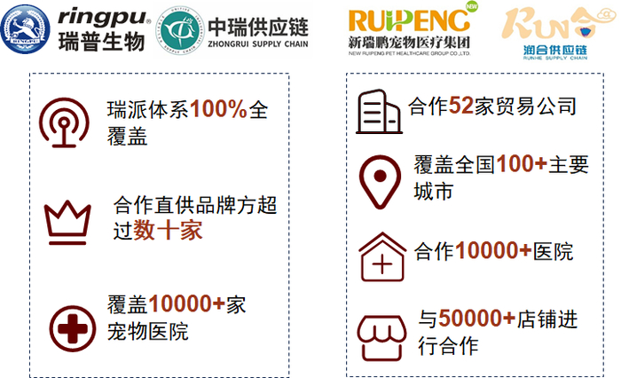 国内动保企业积极布局供应链,实现业务闭环、助力产品放量。1)我们认为动保企业供应链主营业务为宠物商品贸易及物流,其将物流、商品流、资金流、信息流四流合一,因而供应链整合有助于动保企业持续优化提供高质量产品和服务的能力,亦帮助动保企业加速产品推广。其次,动保企业以自建或合作形式积极布局供应链。例如,瑞普生物通过瑞派宠物医院间接持股中瑞供应链,且与中瑞签订集采合同,据公司公告,24年中瑞实现瑞派体系100%全覆盖,合作直供品牌方累计超过数十家,可以覆盖国内超10000家宠物医院,瑞普利用中瑞供应链高效触达产品销售渠道;再如新瑞鹏与润合供应链合作,据新瑞鹏官网,24年润合覆盖100个主要城市、合作10000家以上宠物医院及50000家以上店铺。综上,我们认为动保企业与供应链实现借力发展、渠道资源整合,有助于不断强化动保企业产品推广、运营管理层面竞争力。