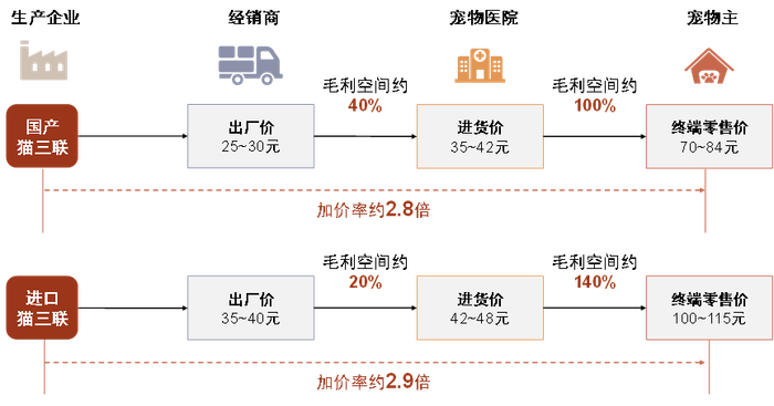 国内企业开启渠道竞争。1)经销端:竞争初期以让利换空间。以宠物疫苗为例,竞争初期,国内动保企业往往以更高的利润空间吸引经销商代理。如我们对猫三联加价链条的推算,24年国产/进口猫三联出厂价分别每头份25~30元/35~40元,终端指导价分别为每头份70~84元/100~115元,全链条加价率分别为2.8/2.9倍,较为接近,而其中国产产品利润空间向前端倾斜,经销商毛利空间约为40%,高于进口产品。2)宠物医院:以持股或合作入局铺货。国产企业常以控股、建立合作等形式切入宠物医院,如瑞普生物持股瑞派宠物医院,通过其连锁门店打通药品销售通道、加速新品推广及渗透,据公司公告,1H24公司合作经销商40余家,覆盖医院超5,700家,其中瑞派宠物医院500多家,占瑞派门店数90%以上。3)线上渠道:旗舰店、微商城等多举并下。如海正动保、瑞普生物等均在天猫开设旗舰店,普安特在微信平台搭建官方微商城等,此外,部分国内品牌在社媒平台投放内容营销,以加强消费者教育、增加产品曝光。