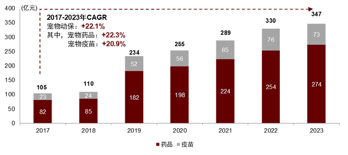 注:1)图中口径为消费端;2)其中2017-2020年宠物疫苗规模由2021-2023年宠物疫苗占宠物动保比例测算