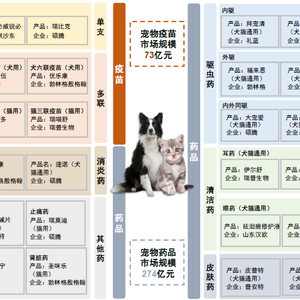 外资企业长期占据竞争主力,国产企业逐步发力入局竞争。目前宠物动保市场集中度较低,规模效应尚不明显。从竞争格局来看,由于外资龙头企业在宠物动保领域起步较早、依托资本整合等方式培育起强大的研发能力,且抢先布局中国市场,其在经销渠道、品牌力打造方面均具有先发优势,因而长期在国内宠物动保领域占据主导位置,代表企业如硕腾、勃林格殷格翰、默沙东、礼蓝等。国内企业则起步较晚,目前宠物业务规模仍较为有限、市场份额较低,且产品主要以药品为主,宠物疫苗市场则基本处于外资产品占据主导状态。近年来,国产企业逐步加码宠物动保赛道,相关产品陆续落地,代表企业如瑞普生物、海正动保、普莱柯等。我们认为国产猫三联疫苗上市标志着宠物动保国产替代元年或已开启,随国产动保龙头研发成果持续兑现,其市场份额或将逐步抬升。