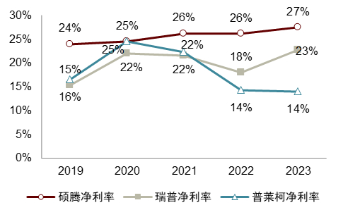 宠物业务成为收入及利润增长的主要来源。从收入端看,23年硕腾宠物业务收入同比+7.2%至55.8亿美元,对应2018~2023年复合增速+16.4%,而整体收入/经济动物收入复合增速则为8.0%/-1.7%,宠物业务已成为整体收入增长的主要动力来源。从利润端看,基于宠物业务盈利空间高于经济动物,硕腾宠物业务占比逐年提升(由12年的35.3%提升至23年的65.3%),硕腾整体净利润率由12年的10.1%提升17.4ppt至27.4%,2012~23年净利润CAGR达+16.5%。