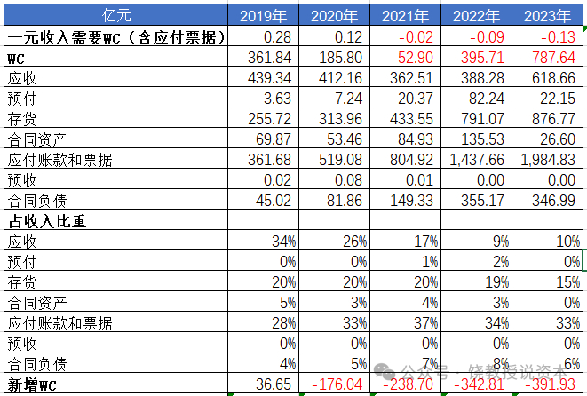 在过去5年,随着比亚迪行业地位的增强,在营运资金方面,呈现负营运资金wc投入,2023年仅WC为-788亿,可以比照理解为,比亚迪净占用了供应商资金完成日常运营。