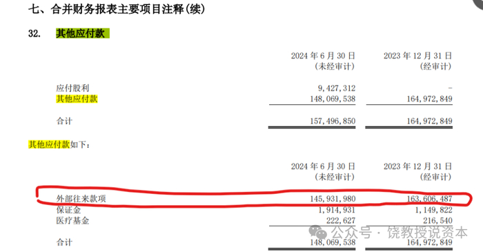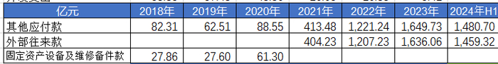 2018-2020年明细中,并没有“外部往来款项”这个项目,而是“固定资产设备及维修配件”,2021年开始其他应付款明细中不再有固定资产设备项目而代之以外部往来款。根据其他应收款的定义,应付设备款,也就是欠设备供应商的款确实应该放在其他应付款中,那么,2024年中的1480亿外部往来款是不是设备应付款?