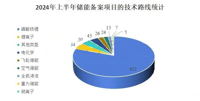 从储能项目的技术路线来看,磷酸铁锂是我国2024年上半年主要的储能技术,共有932个储能项目采用的此类技术,其中1月有151个,2月61个,3月156个,4月192个,5月199个,6月173个。锂离子电池和电化学储能也是比较火热的储能技术之一,其备案数量分别为54个和45个。
