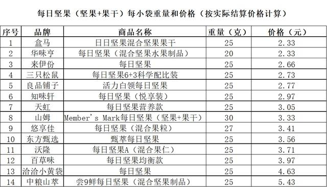 因为本次测评主要以小袋装产品为主,我们比对了下每小袋的实际购买价格,从低到高排了个序↓↓↓