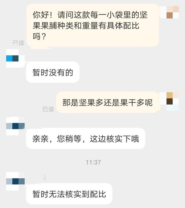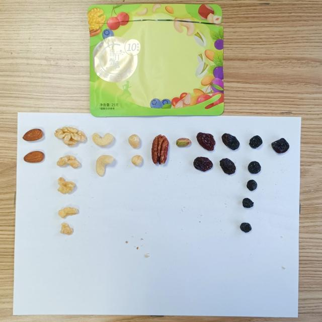 有的产品没有宣传具体的占比数据,客服也不清楚,在对某品牌“每日坚果”产品随机抽取的10小袋称重后发现,核桃仁含量最多的一袋有9.038克,最少的一袋只有1.92克(约0.75个核桃),只占每袋净含量的7%,而这一小袋里的红葡萄干重8.328克,占了32%的份量。