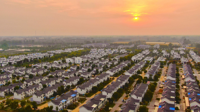 夕阳余晖洒满湖畔旺屯,将一排排新中式徽派农房染上金色,如诗如画。