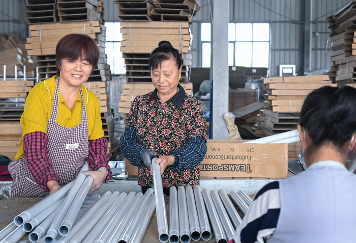 湖畔旺屯村的孙成英(中)在家门口一家体育器材企业打工。