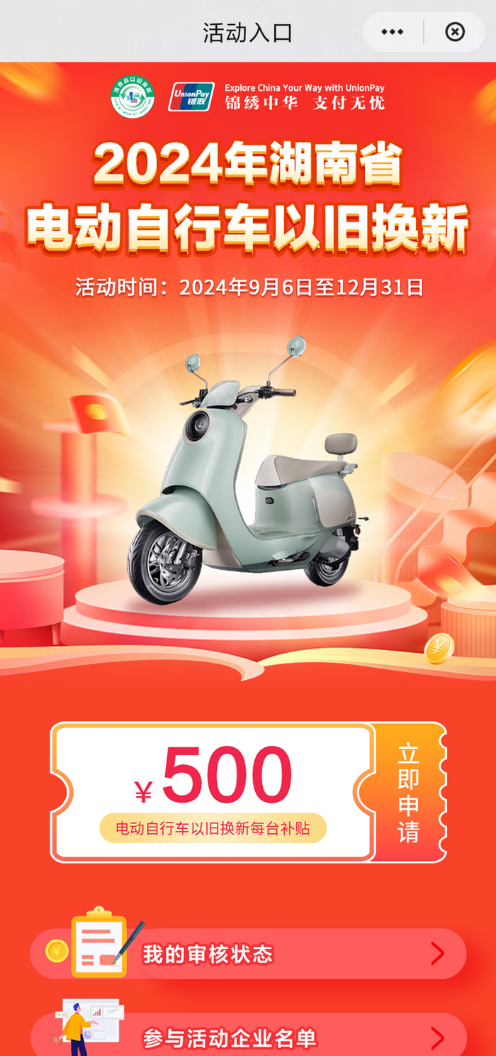3、本次活动所指的电动自行车新车,是指符合《电动自行车安全技术规范》(GB17761)要求的电动自行车,后续以国家最新标准为准。