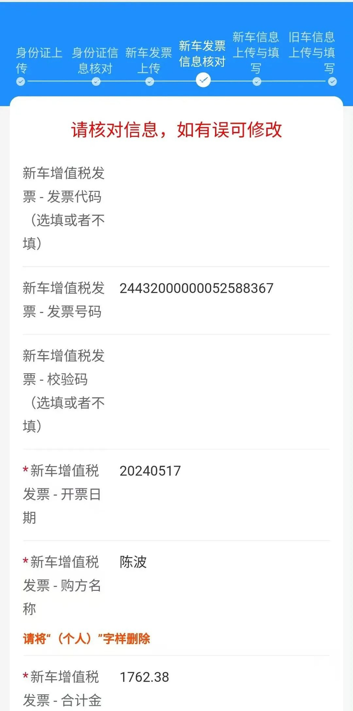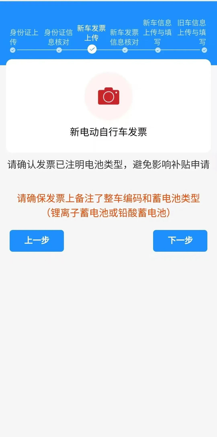 ✔ 符合国家规定的发票照片。发票名称为申领人姓名,统一社会信用代码/纳税人识别号为申领人身份证号,备注整车编码和蓄电池类型(锂离子蓄电池或铅酸蓄电池)。