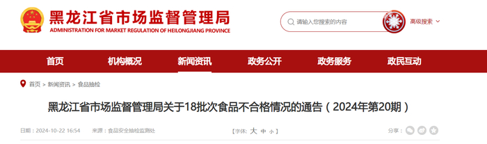 黑龙江省市场监督管理局关于18批次食品不合格情况的通告(2024年第20期)