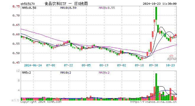 10月23日,截止午间收盘,食品饮料ETF(515170)涨1.35%,报0.599元,成交额6669.27万元。食品饮料ETF(515170)重仓股方面,贵州茅台截止午盘涨1.53%,五粮液涨1.84%,伊利股份涨1.99%,泸州老窖涨2.13%,山西汾酒涨2.14%,海天味业涨1.66%,洋河股份涨0.68%,古井贡酒涨3.13%,今世缘涨3.42%,东鹏饮料涨0.13%。