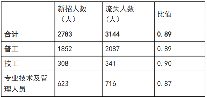 2024年第3季度,350家监测样本企业新招员工2783人,流失3144人,比值为0.89。其中:普工新招1852人,流失2087人,比值为0.89;技工新招308人,流失341人,比值为0.90;专业技术及管理人员新招623人,流失 716人, 比值为0 .87。