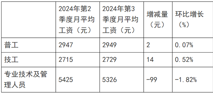 从用工规模上看,2024年第3季度我市监测样本企业依旧以普工需求为主体,占比59.82%,专业技术人员及管理人员数量则有所增加,较第2季度增加了181人,普工及技工用工人数有所下降但波动较小(见表1)。